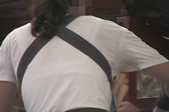 続いて2分ごろより野外でのパレードシーンへ!パレード前のビギナーからちょい上のバトン娘のチームT・レギンス姿をじっくりと。