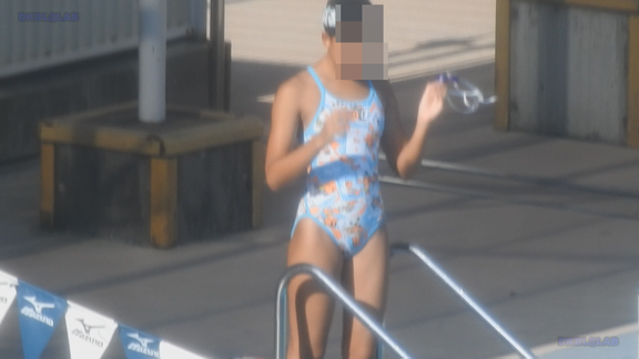 42分ごろから別日へ、こちらはうって変わってVキョウスイ娘たちが髪をスイムキャップにINするシーンからゆる~くスタート。三々五々Vキョウスイ娘たちが集まって水になじんでおります。