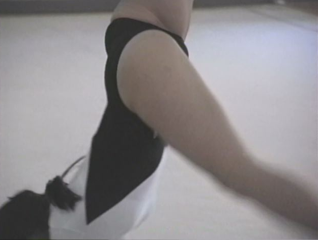 冒頭は珍しくタンバリンを使ってのは発表。レオタードは鮮やかで両手がふさがっているのでクイコミが直せないようです。