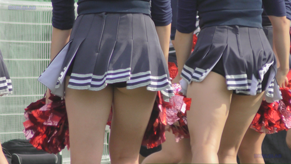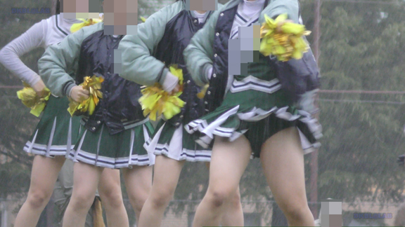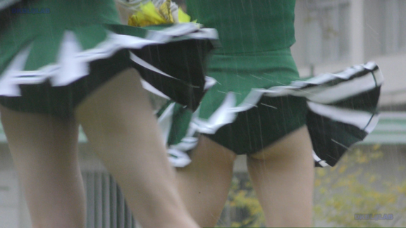 続いて土砂降りの雨の中、白・緑チアユニ娘の応援シーンへ!ずぶ濡れのチア衣装、そしてハイキックも連発!緑Vアンダーがコンニチワ!すごい状況になっております!