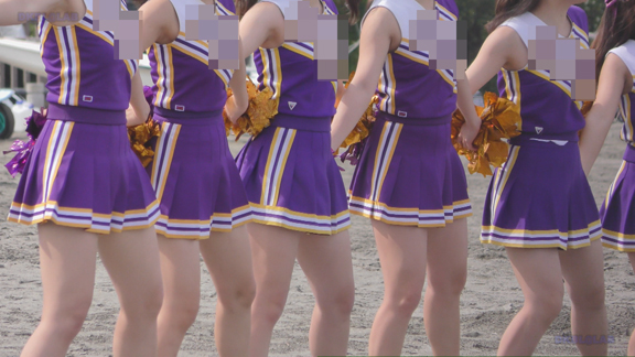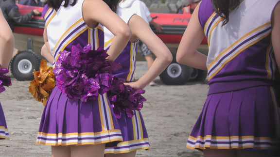砂浜での紫・白チアユニ娘の平場応援演技シーンからスタートです!ハイキックシーンでは紫アンダーがコンニチワ!