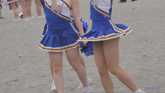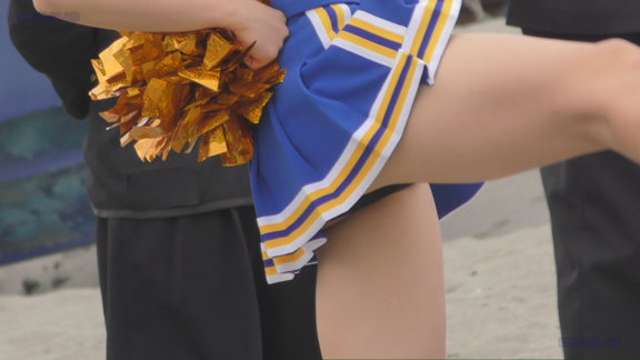 4分ごろより青・白チアユニ娘の登場です!片肩オープンの可愛い衣装!同じく砂浜での応援前準備シーンから応援本番シーンまで収録!