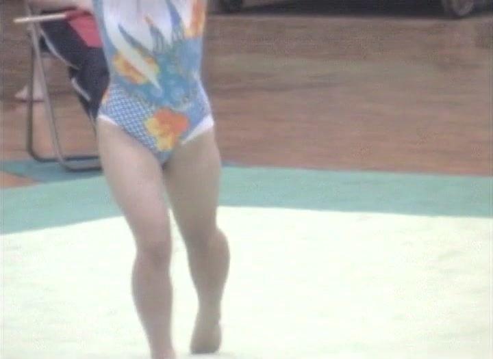 前半に登場の水色白のカラフルレオタードの選手はおっと、ハミしてます。見事な演技なので出てしまったのでしょうか?