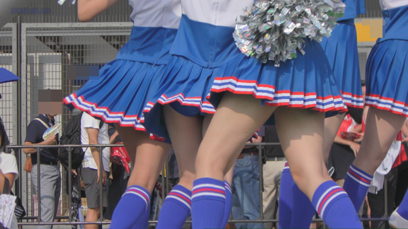 そして3分ごろより青・白・赤チアユニ娘のステージ演技がスタート!ノースリーブの上衣もさることながら、ハイキックの連発で青Vアンダーがコンニチワンワン!!!なかなかの長尺でお届け致します!